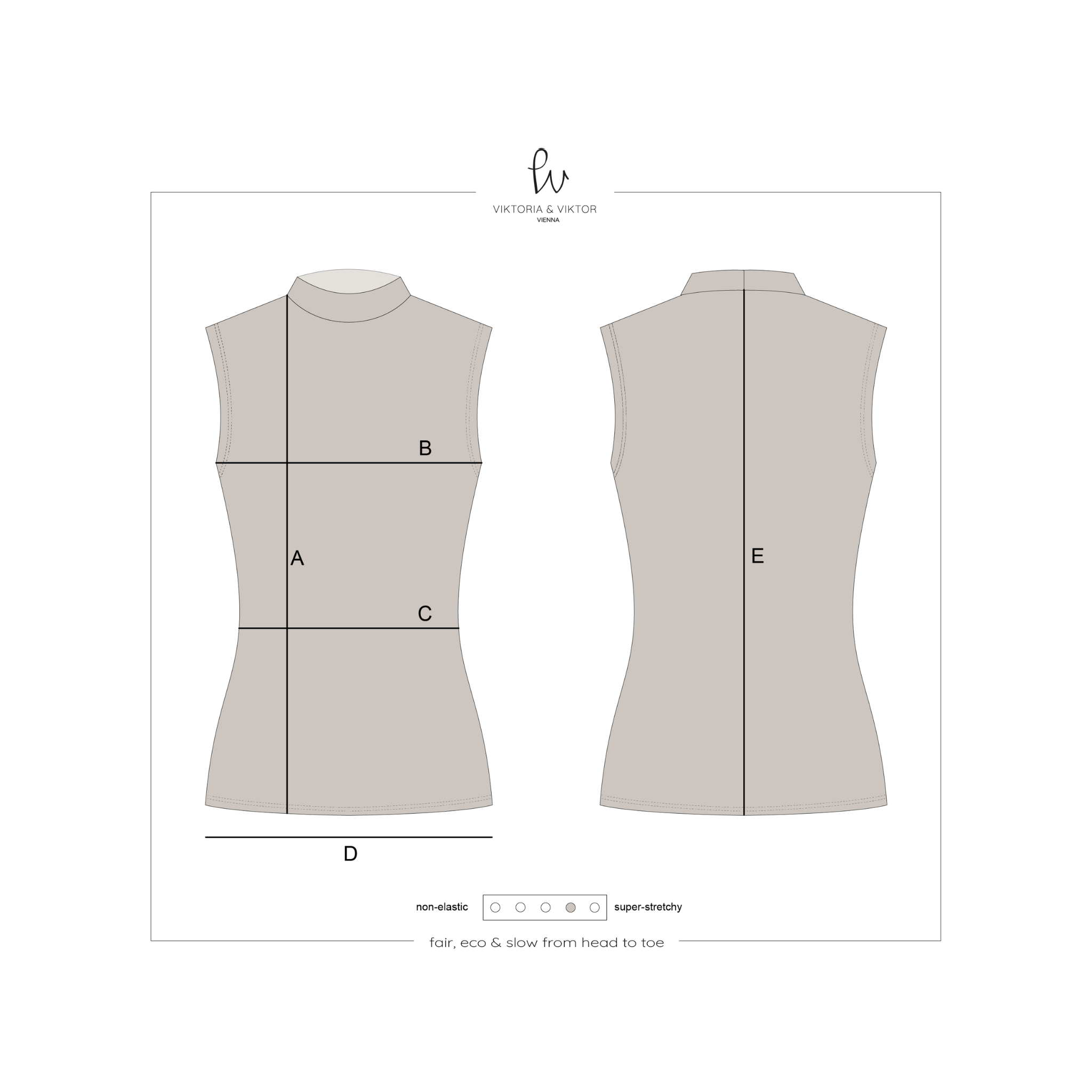 The sleeveless jersey top with stand-up collar is figure-hugging, hip-length, elegant and simple at the same time.